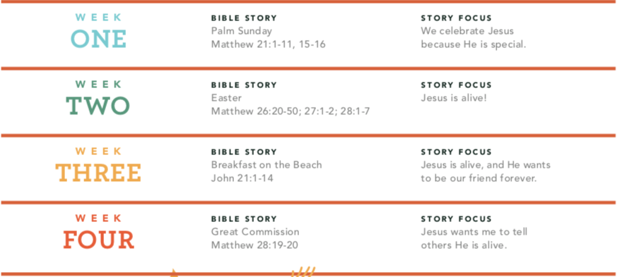 This month, our preschoolers are learning that Jesus is alive! Watch this video and then take a look below at each week and the specific story your child will hear. As you scroll, you'll also see a few downloadable resources that you can use to help continue the conversation at home with your kids.